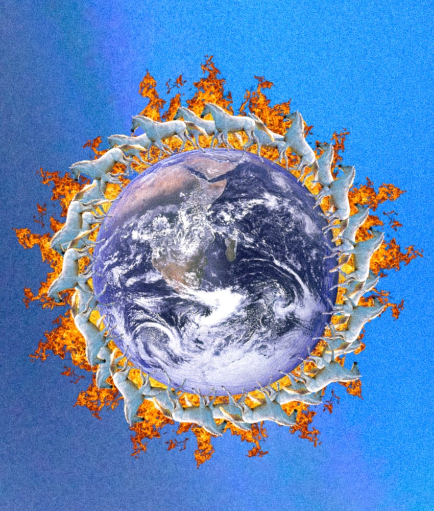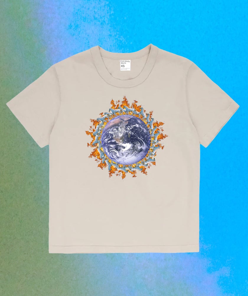 Horse, fire, earth, DTF print on a 100% Recycled cotton, EverybodyWorld fitted tee. Very '70s band tee fit.